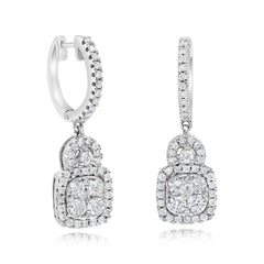 1.49 ct. Diamond 18K White Gold Square Cluster Flower Halo Huggie Hanging Earrings