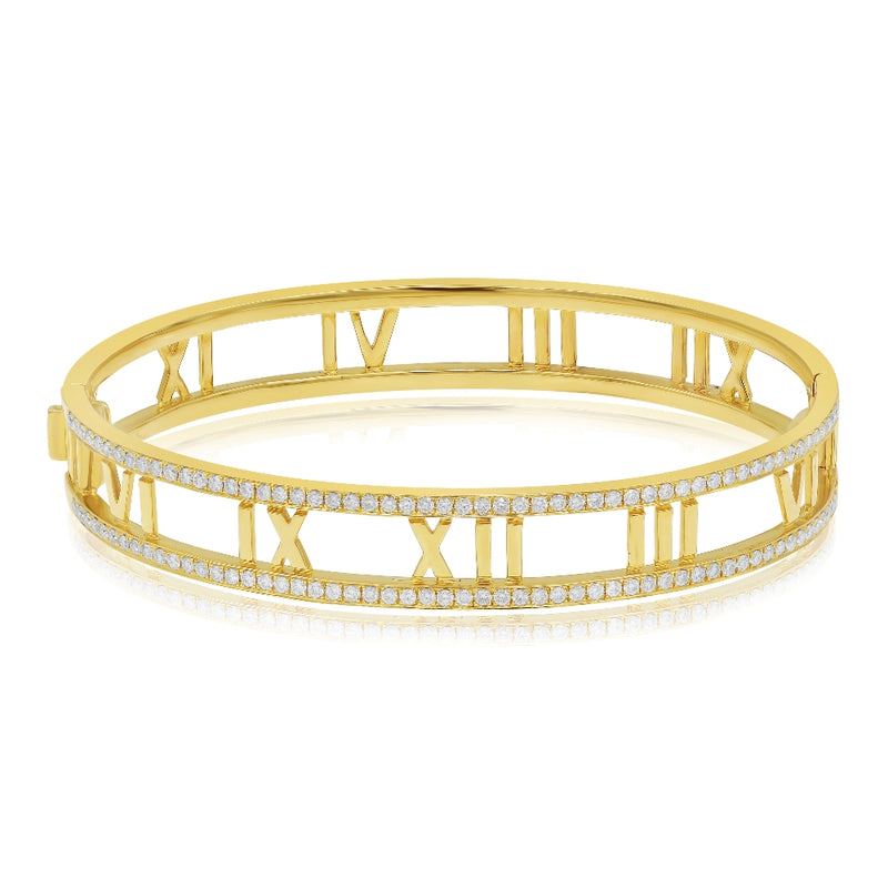 1.23 ct. Diamond 18K Yellow Gold Roman Numerals Decor Bangle Bracelet
