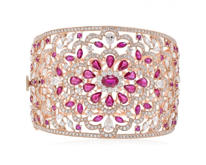 10.98 ct. Ruby & 12.53 ct. Diamond Flower Cuff Bangle Bracelet