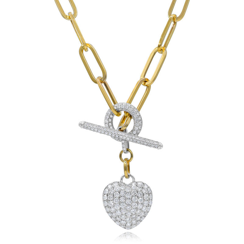 3.58 ct. Diamond 14K Two Tone Gold Heart Lock Toggle Paperclip Link Statement Necklace 24"