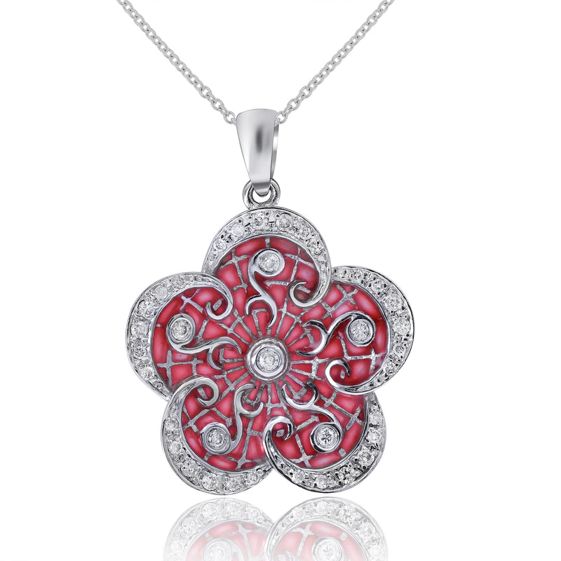 0.27 ct. Diamond 14K White Gold Red Enamel Brilliant Flower Pendant